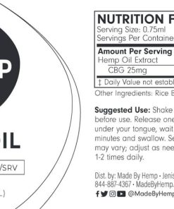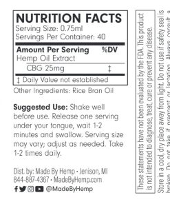 By following the above instructions, you will get around 40 servings in total from the bottle. The Made By Hemp CBG oil tincture contains 25mg of CBG per serving.